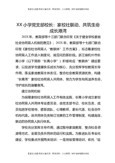 XX小学党支部校长:家校社联动,共筑生命成长港湾.doc