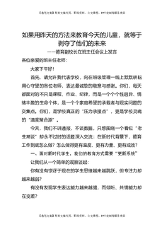 德育副校长在班主任会议上发言:如果用昨天的方法来教育今天的儿童,就等于剥夺了他们的未来.doc