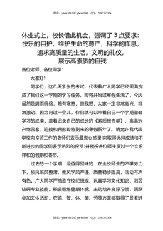 休业式上,校长借此机会,强调了3点要求:快乐的自护,维护生命的尊严,科学的作息,追求高质量的生活,文明的礼仪,展示高素质的自我.doc