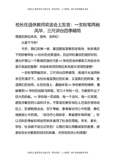 校长在退休教师欢送会上发言:一支粉笔两袖风华,三尺讲台四季晴雨.doc
