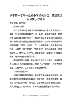 秋季第一学期休业式小学校长讲话:总结成长,安全快乐过寒假.doc