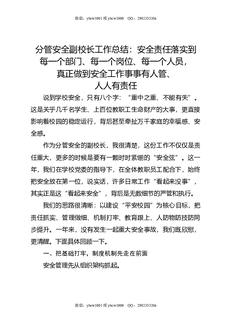 分管安全副校长工作总结:安全责任落实到每一个部门,每一个岗位,每一个人员,真正做到安全工作事事有人管,人人有责任.doc