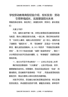 学校劳动教育典型经验介绍,校长发言:劳动引领幸福成长,实践塑造阳光未来.docx