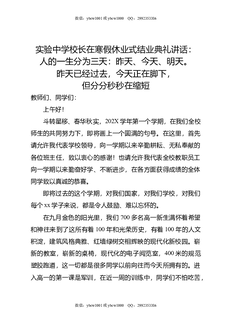实验中学校长在寒假休业式结业典礼讲话:人的一生分为三天:昨天,今天,明天,昨天已经过去,今天正在脚下,但分分秒秒在缩短.doc
