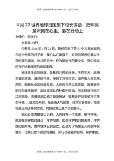 4月22世界地球日国旗下校长讲话:把环保意识刻在心里,落在行动上.docx