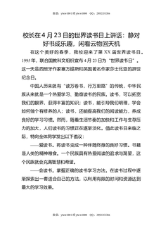 校长在4月23日的世界读书日上讲话:静对好书成乐趣,闲看云物回天机.docx