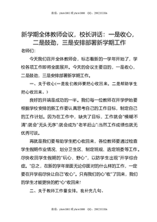 新学期全体教师会议,校长讲话:一是收心,二是鼓劲,三是安排部署新学期工作.docx