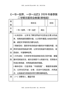 《一书一世界,一字一光芒》2026年春季第二学期主题班会教案(表格版).docx