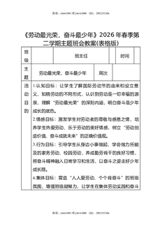《劳动最光荣,奋斗最少年》2026年春季第二学期主题班会教案(表格版).docx
