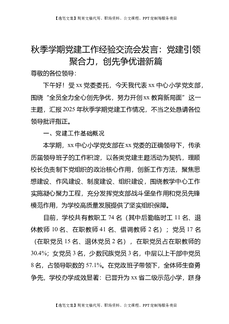 秋季学期党建工作经验交流会发言:党建引领聚合力,创先争优谱新篇.doc