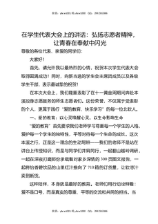 在学生代表大会上的讲话:弘扬志愿者精神,让青春在奉献中闪光.docx