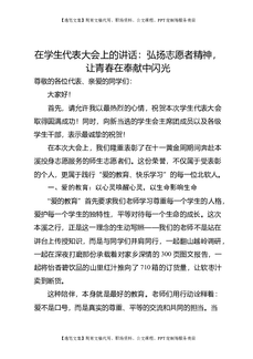 在学生代表大会上的讲话:弘扬志愿者精神,让青春在奉献中闪光.doc