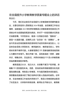在全县提升小学教育教学质量专题会上的讲话.docx