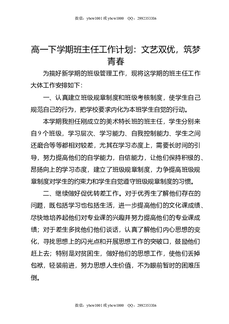 高一下学期班主任工作计划:文艺双优,筑梦青春.doc