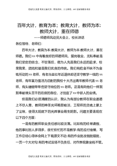 师德师风动员大会上,校长讲话:百年大计,教育为本;教育大计,教师为本;教师大计,重在师德.doc