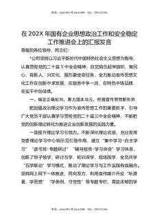 在202X年国有企业思想政治工作和安全稳定工作推进会上的汇报发言.doc