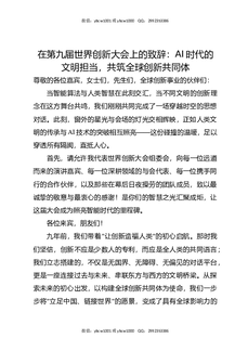 在第九届世界创新大会上的致辞:AI时代的文明担当,共筑全球创新共同体.docx