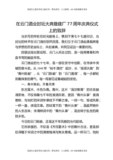 在云门酒业封坛大典暨建厂77周年庆典仪式上的致辞.docx