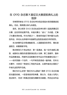 在《XX》杂志第X届征文大赛颁奖典礼上的致辞.docx