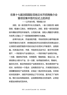 在第十七届浏阳国际花炮文化节招商推介会暨项目集中签约仪式上的讲话:以开放为笔,写财富之诗.docx