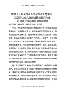 在第十六届全国企业文化年会上的讲话:以优秀企业文化推进民族复兴伟业,以卓著企业品牌凝聚发展力量.docx