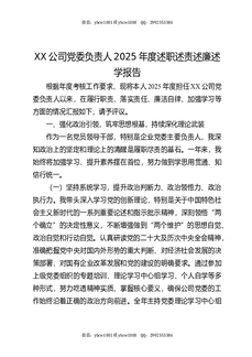 XX公司党委负责人2025年度述职述责述廉述学报告.docx