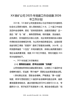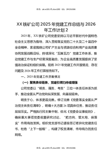 XX铁矿公司2025年党建工作总结暨2026年工作计划.docx