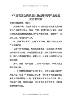XX建筑国企高质量发展战略新兴产业经验交流会发言.docx