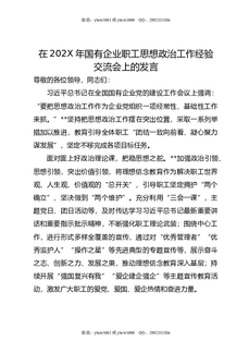 在202X年国有企业职工思想政治工作经验交流会上的发言.doc