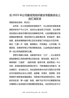 在202X年公司基层党组织建设专题推进会上的汇报发言.docx