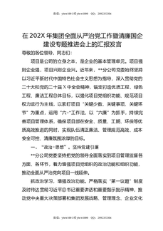 在202X年集团全面从严治党工作暨清廉国企建设专题推进会上的汇报发言.docx