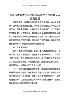 市国资委党委书记2025年度民主生活会个人发言提纲.docx