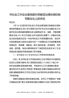 市社会工作会议暨党建引领基层治理协调机制专题会议上的讲话.docx