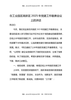 在工业园区高新区2025年党建工作联席会议上的讲话.docx