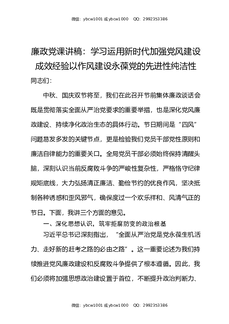 廉政党课讲稿:学习运用新时代加强党风建设成效经验以作风建设永葆党的先进性纯洁性.docx