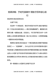 党课讲稿:于时代浪潮中领航守百年初心前行.docx