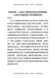 党课讲稿:以铢积寸累的韧劲夯实思想根基,以枝叶关情的初心筑牢廉政防线.docx