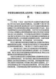 寺管委会廉政党课上的讲稿:守廉正心履职为民.docx