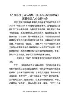 XX同志关于深入学习《总书记谈治国理政》第五卷的几点心得体会.docx