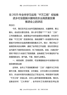 在2025年全市学习运用“千万工程”经验推进乡村全面振兴暨特优农业高质量发展推进会上的讲话.docx