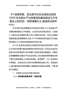 XX县委常委、政法委书记在全县政法系统2026年全面从严治党暨党风廉政建设工作专题会上的讲话:深耕清廉沃土,锻造政法铁军.docx