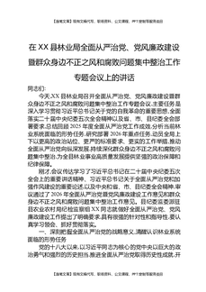 在XX县林业局全面从严治党、党风廉政建设暨群众身边不正之风和腐败问题集中整治工作专题会议上的讲话.docx