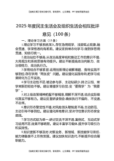 2025年度民主生活会及组织生活会相互批评意见(100条).docx