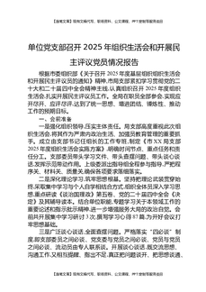 单位党支部召开2025年组织生活会和开展民主评议党员情况报告.docx
