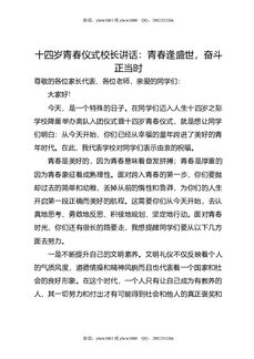 十四岁青春仪式校长讲话:青春逢盛世,奋斗正当时.doc
