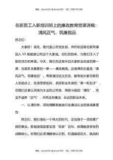 在新员工入职培训班上的廉政教育党课讲稿:清风正气,筑廉致远.docx