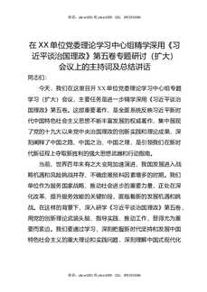 在XX单位党委理论学习中心组精学深用《总书记谈治国理政》第五卷专题研讨(扩大)会议上的主持词及总结讲话.docx