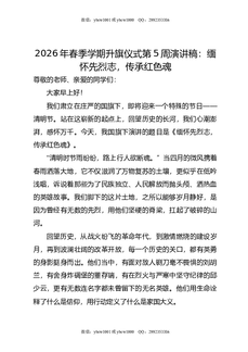 2026年春季学期升旗仪式第5周演讲稿:缅怀先烈志,传承红色魂.doc