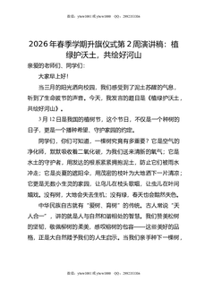 2026年春季学期升旗仪式第2周演讲稿:植绿护沃土,共绘好河山.doc