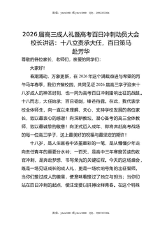 2026届高三成人礼暨高考百日冲刺动员大会校长讲话:十八立责承大任,百日策马赴芳华.doc